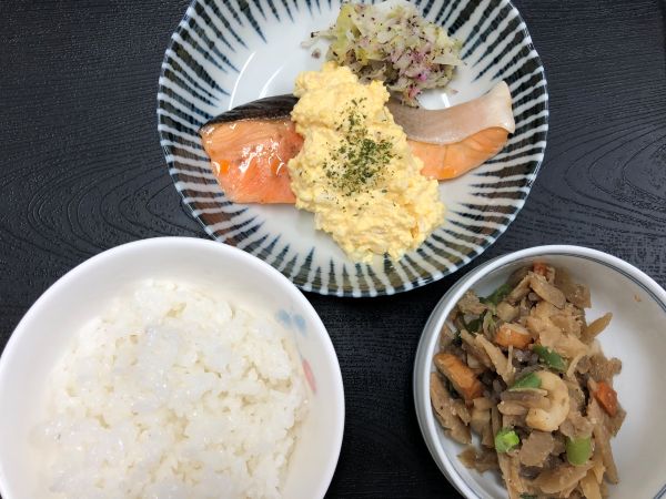 満寿園では、主菜はたんぱく質がしっかり摂れるように、肉、魚、大豆製品、卵、副菜はビタミン・ミネラル・食物繊維を意識し、野菜、きのこ類、芋類を中心に組み合わせています。