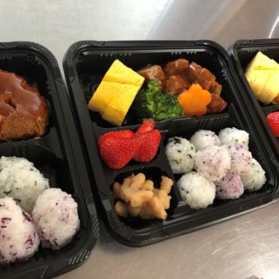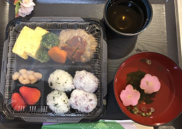 桜が見頃を迎えた4月2日の昼食には、毎年恒例のお花見弁当をご用意しました。