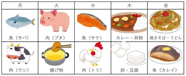 ある5日間の一例です。この様に食材が被っていないか気にかけています。